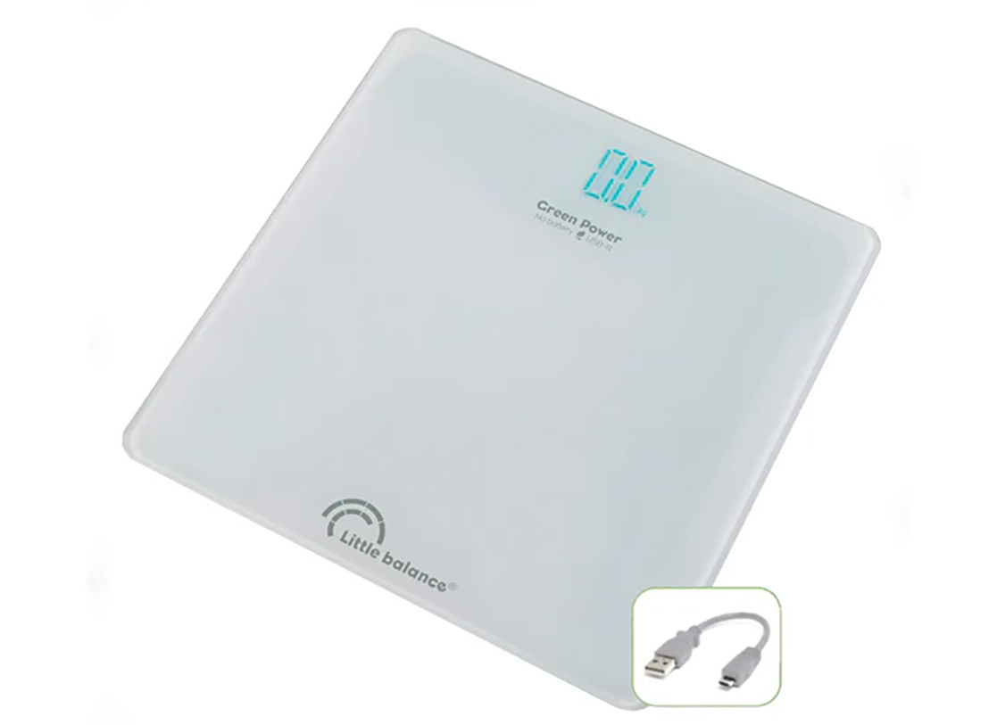 Badevægt fra Little Balance som er opladbar med Blue Tech USB. Du skal derfor ikke huske at skifte batteri. Vægten kan veje op til 200 kg.