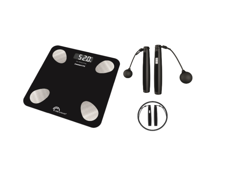 Badevægt fitness vægt i smart sort design. Little Balance 8685 indeholder et fitness Kit: 1 tilsluttet impedansmåler + 1 USB-tilsluttet sjippetov til at holde styr på din form og træning: Perfekt til både atleter og begyndere